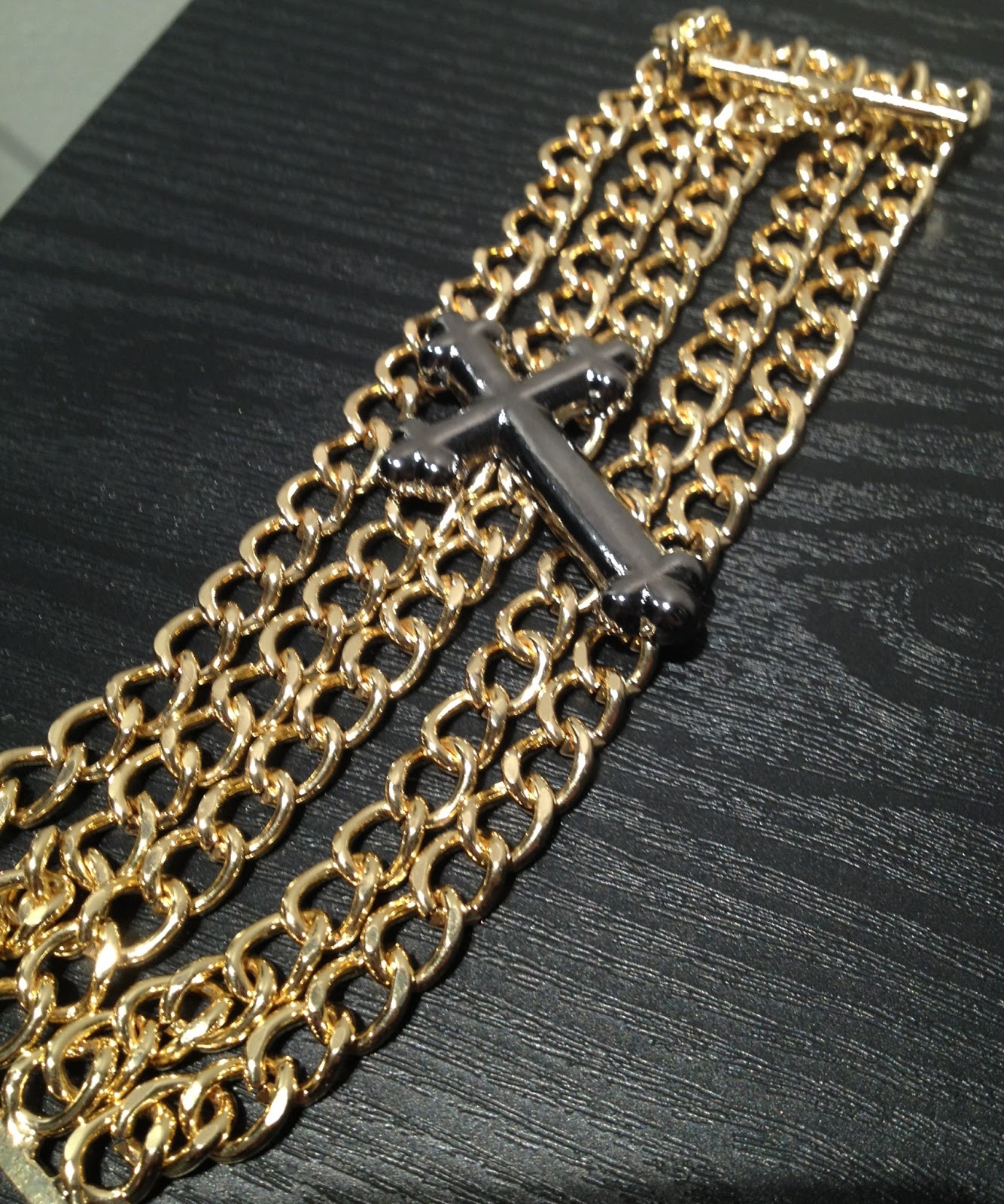 The second cross, chain cuff cost a bit more (£12 from ASOS) but is so gorgeous it's definitely worth it. I only bought it recently and it hangs really beautifully on the wrist. This would go well with a short-sleeved garment, since it hangs so low and takes up to much space on the wrist. I wouldn't advise wearing it with prints though, same with other 'busy' jewellery, as it can look a bit messy.